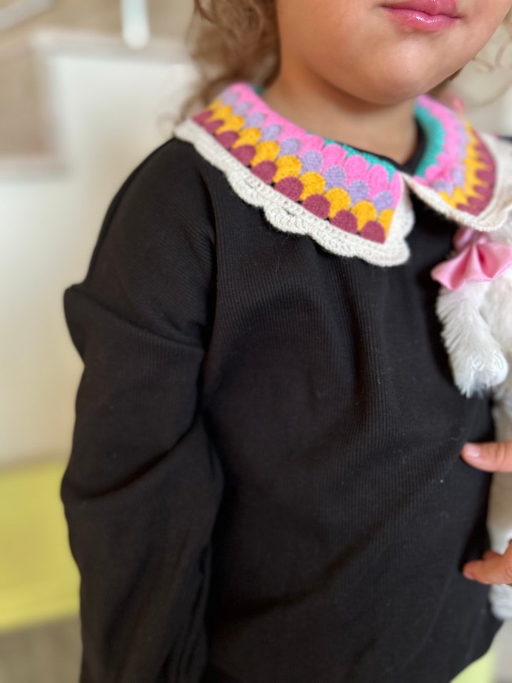 Renkli nakışlı detaylara sahip, uzun kollu, yakalı ve bol kesim kız bolero. Örgü yapısıyla yumuşak bir doku sunar.