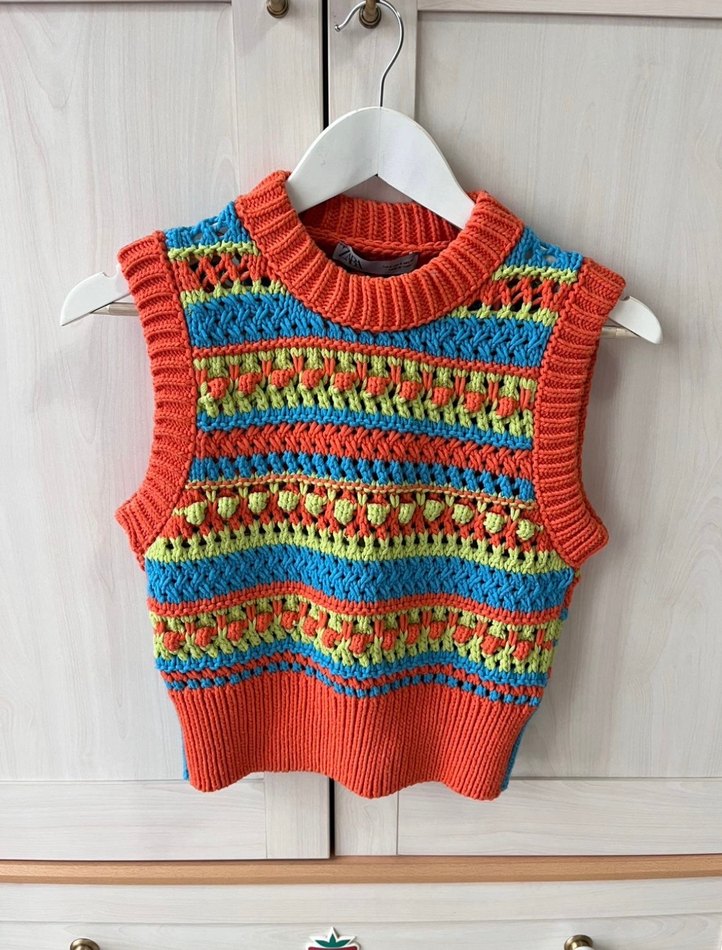Nakışlı, kısa ve fitted kesim örgü süveter, kolsuz ve yuvarlak yakalı, bohem tarzı ve renkli desenlerle öne çıkar.