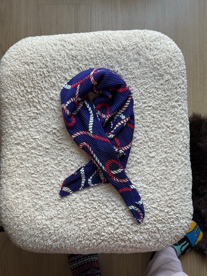 Renkli, pliseli sentetik kumaştan yapılmış kadın fular, çağdaş Paris tarzıyla bohem ve retro dokunuşlar sunar.
