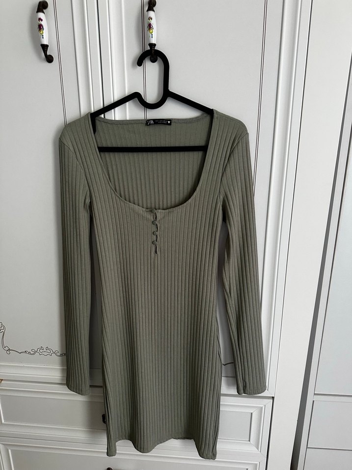 Zara S Bedeb Düğmeli, Uzun Kollu Gri Triko Elbise