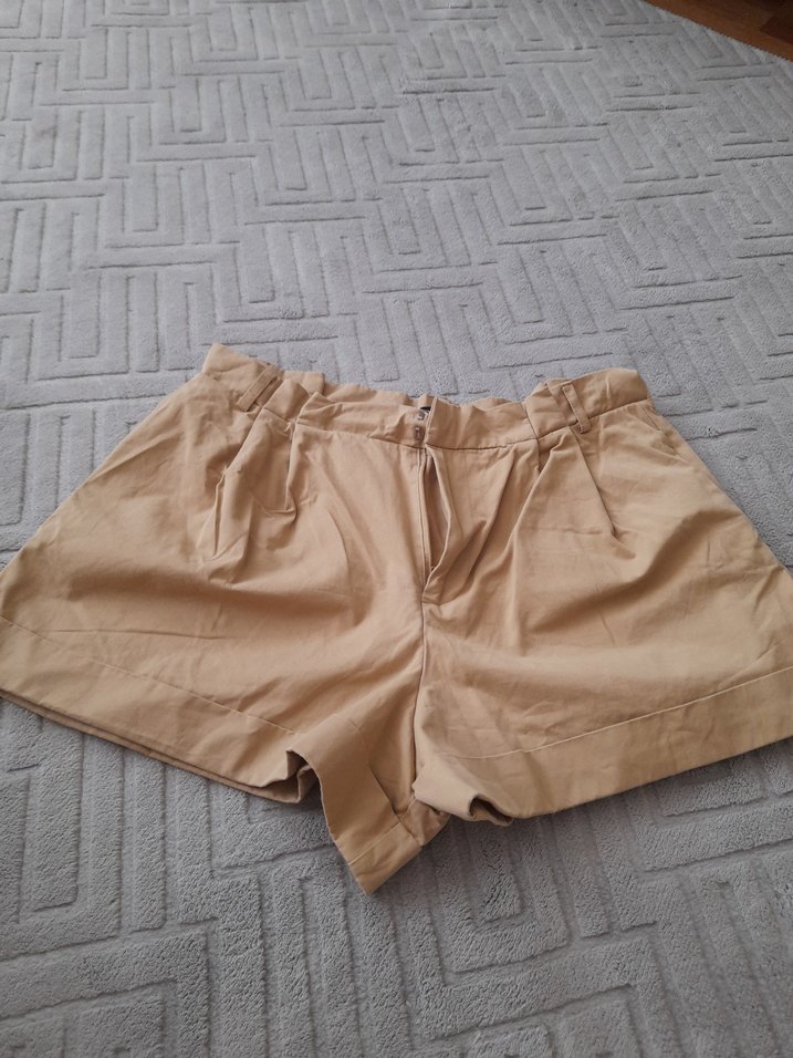 Bej renkli kumaştan, salaş kesim ve mini boyda, günlük kullanıma uygun rahat şort. 38 beden.