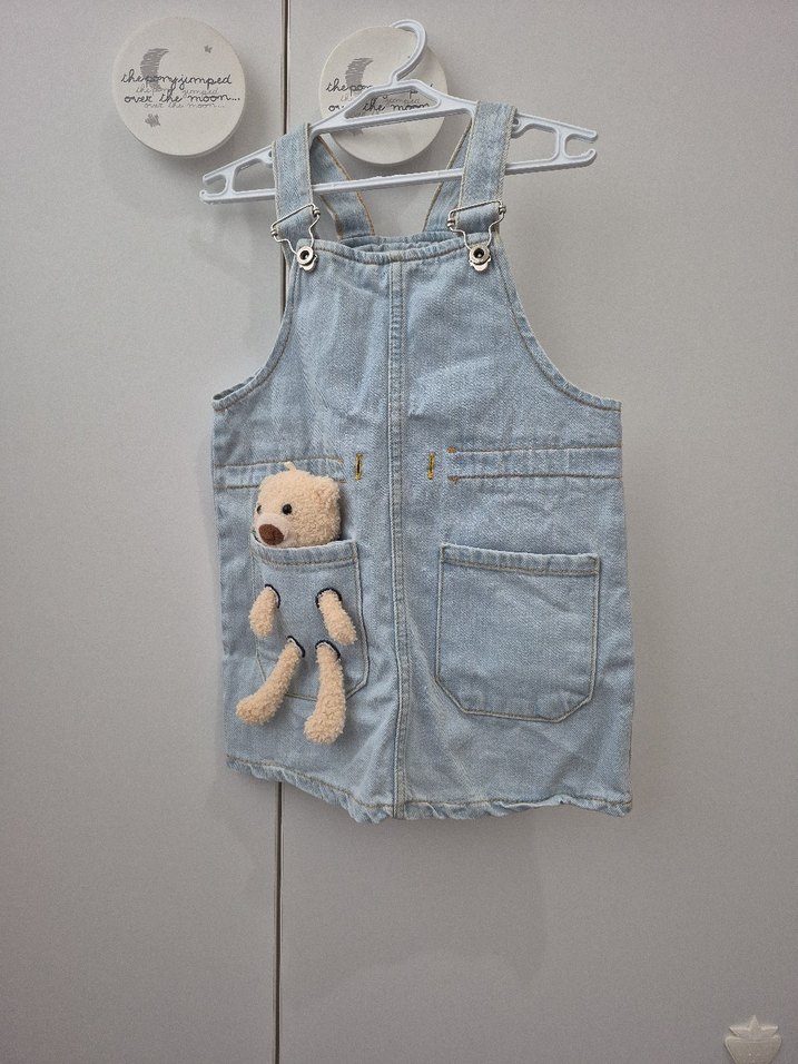 Askılı, fitted kesim pastel mavi kot tulum. Tokalı kayışlar ve nakış detayları bulunur. Ön cepte küçük oyuncak ayı aksesuarı vardır.