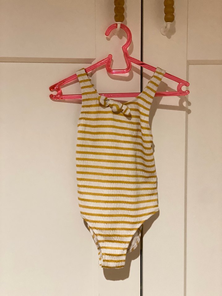 Sarı çizgili, askılı kız çocuk mayosu. Plaj ve günlük kullanıma uygun, rahat ve şık tasarım. 12-24 Ay.