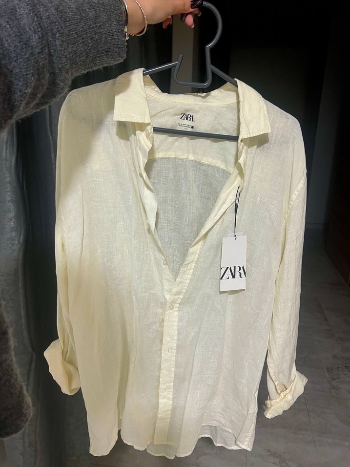 Zara marka sarı keten gömlek, uzun kollu ve yakalıdır. Düğmeli, bol kesimli, hafif ve desensizdir, günlük rahat sokak stili için uygundur. Tam bir butter yellow çok tatlış harika bir gömlek