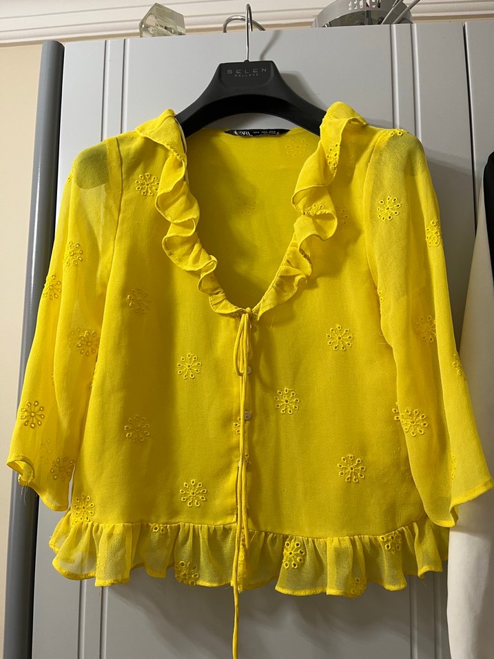 Zara Sarı Renk Fırfırlı V Yaka Kadın Bluz