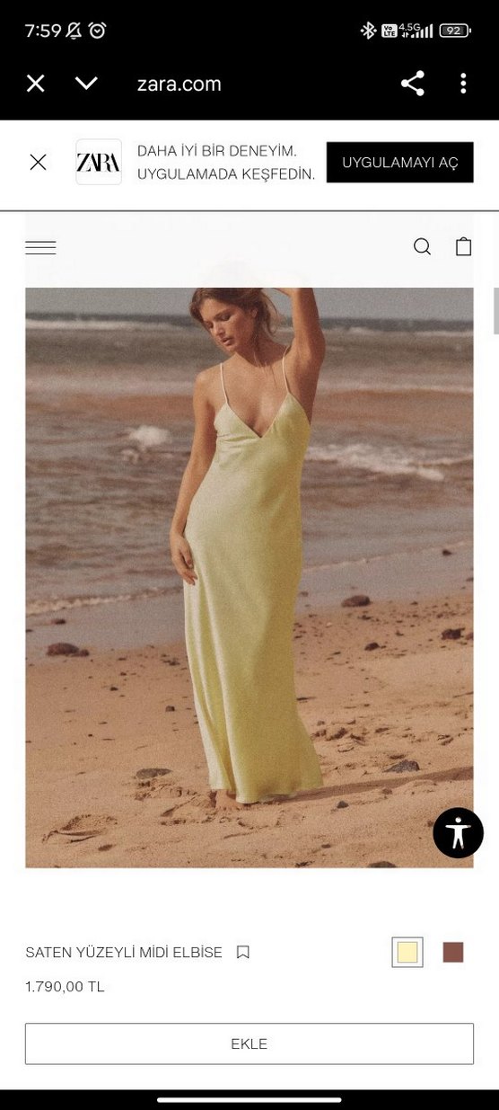 Sarı uzun elbise, V yakalı ve askılı, dökümlü tasarıma sahiptir. saten kumaştan yapılmış, bol kesim ve bohem elbise