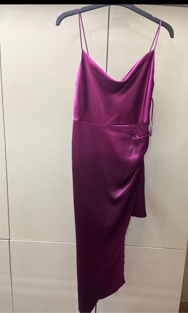 Pembe mürdüm arası renkli, drapeli ve askılı uzun abiye elbise, straplez yakası ve vücuda oturan kesimiyle romantik gece için uygundur.