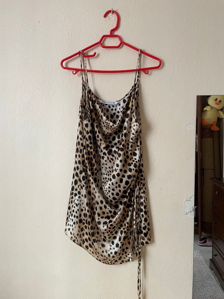 Leopar desenli, askılı, drapeli ve kısa kesim bol hamile bluz, sokak modasına uygun.