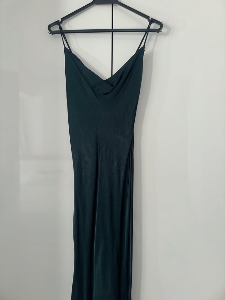 Lacivert uzun elbise, drapeli V yaka ve ince askılarla tasarlanmıştır. İpek gibi kumaştan olup, romantik akşamlar için uygun, vücuda oturan kesime sahiptir. Minimalist ve goth tarzda.