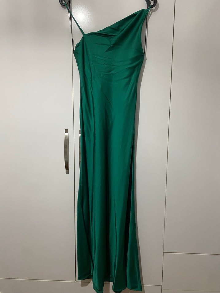 Yeşil drapeli, askısız ve kolsuz uzun elbise. İnce kesimi ve ipeksi dokusuyla çağdaş ve minimalist tarz için uygundur.