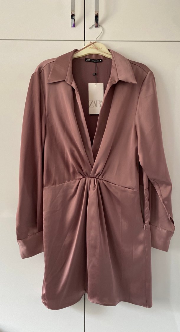Zara kadın elbise, uzun kollu ve bol kesimdir. Parlak saten kumaştan yapılmış, midi boy ve desensizdir. Streetwear tarzına uygundur. ✨