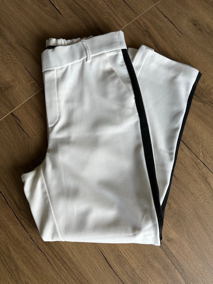 Zara Şeritli Beyaz Straight Pantolon. Arka bel kısmında çok küçük belirsiz bir sarılık var, görsellerde yakından çekilmiş hali mevcut