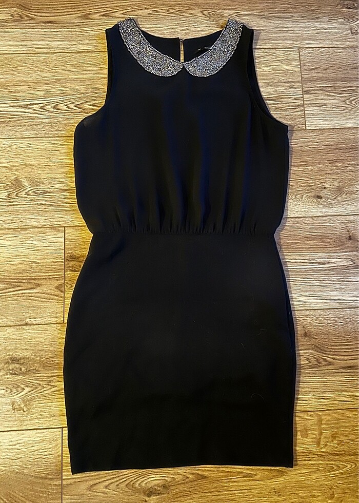 Yakası taşlı elbise. Özel günlerde rahatlıkla kurtaracak şık ve sade bir modeldir.Üst kısmı iç göstermeyecek şekilde çift kat tül, alt kısmı ise likralı kumaştır.Denemek dışında kullanılmamıştır.Sorunsuzdur. Beden Etikette L görünüyor amcak s-m uyumludur. Çünkü etek kısmı likralı bir kumaş. Large giyenlere olacağını düşünmüyorum. O yüzden M olarak işaretledim. Üstte duruşunu görmeniz için çok benzer başka iki fotoğraf bulup ekledim.