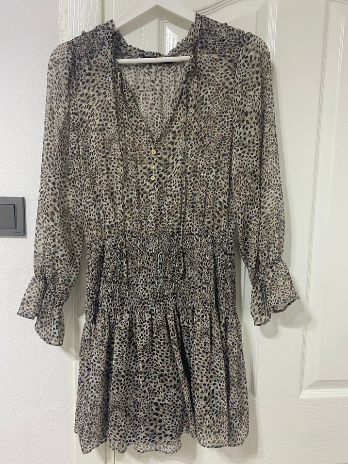 desenli mini elbise. Uzun kollu ve V yaka, fırfır detaylarıyla bohem tarzda, kumaşı şifon ve etekte astar mevcut. İçinde gold simli iplerle geçiş var .Sıfır- etiketsiz