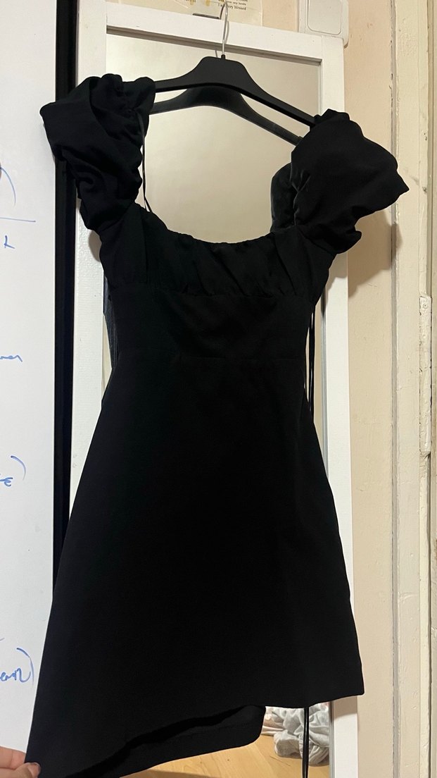 Siyah mini elbise, V yaka ve kısa balon kollara sahip, pürüzsüz sentetik kumaştan üretilmiştir. Minimalist tarzıyla romantik akşamlar için zahmetsiz şıklık sunar. Zara marka elbise sadece bir kere balo günü giyilmiştir yepyeni defosuz tertemiz durmaktadır