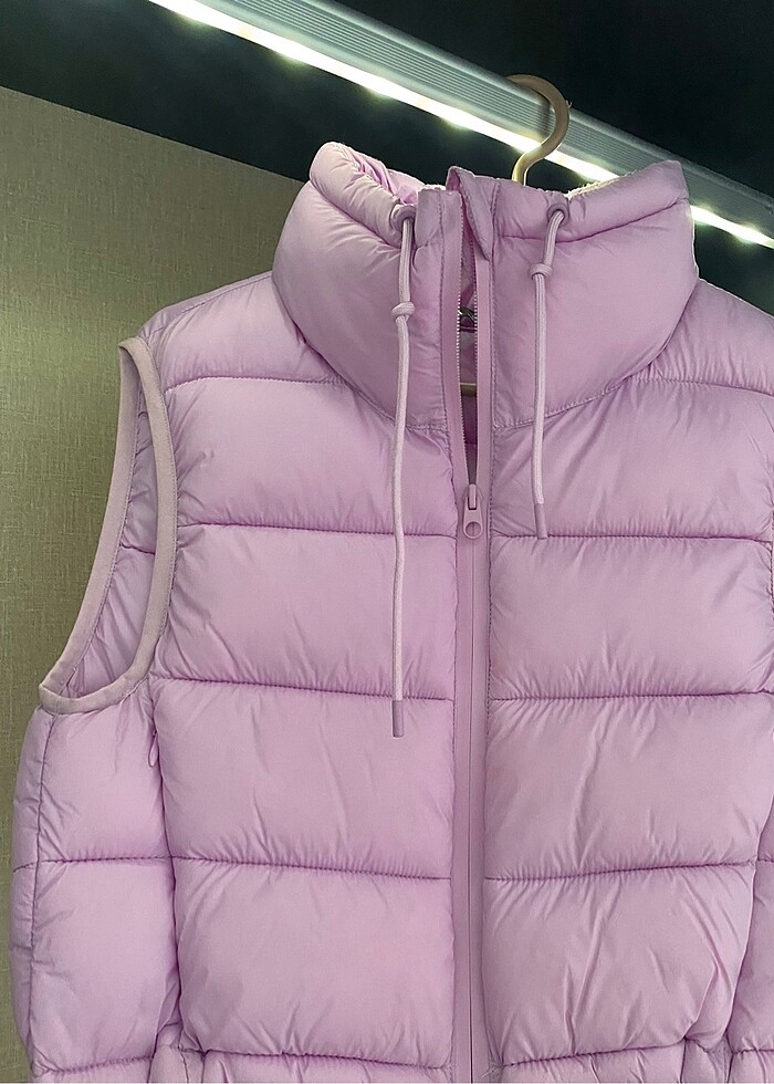Lila rengi crop şişme yelek, tam kalıp oversize değil.