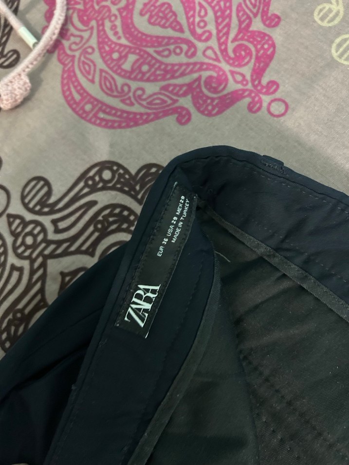 Zara marka, siyah baskılı, regular fit, fermuarlı, sentetik kumaştan yapılmış midi uzunlukta kumaş pantolon.