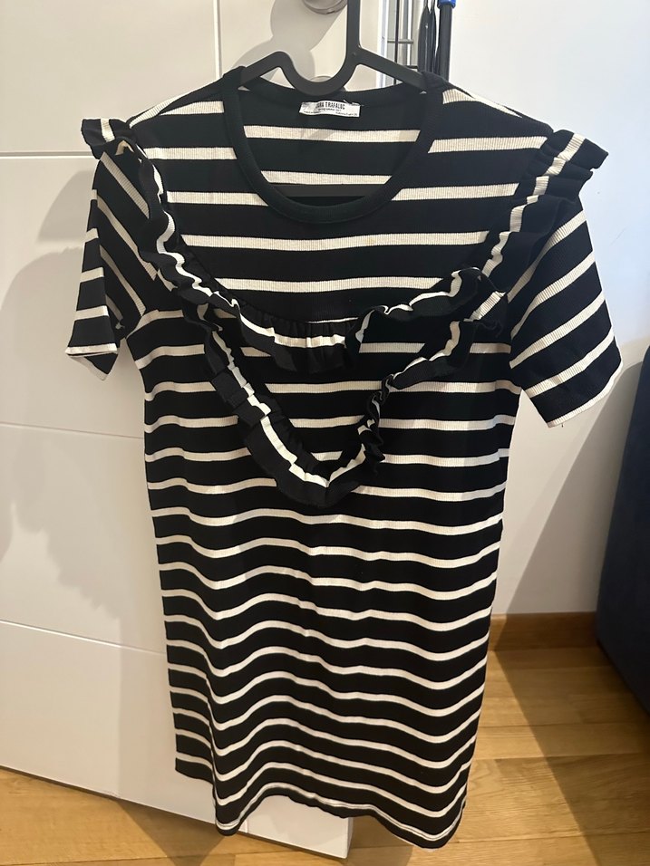 Siyah beyaz çizgili midi elbise, kısa kollu ve yuvarlak yakalıdır. Fırfır detayları ve vücuda oturan kesimiyle dikkat çeker. Sadece 1 kere kullanılmıştır, sorunsuzdur.boyu 80 cm’dir. Koltuk altından koltuk altına 46 cmdir.