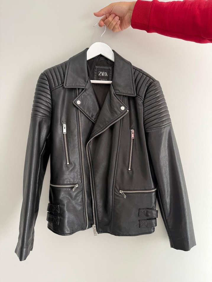Zara siyah deri biker ceket, çıtçıtlı yaka ve fermuarlı ceplere sahip. Strappy kollu, regular fit, Paris esintili rock punk tarzında, günlük kullanıma uygun.