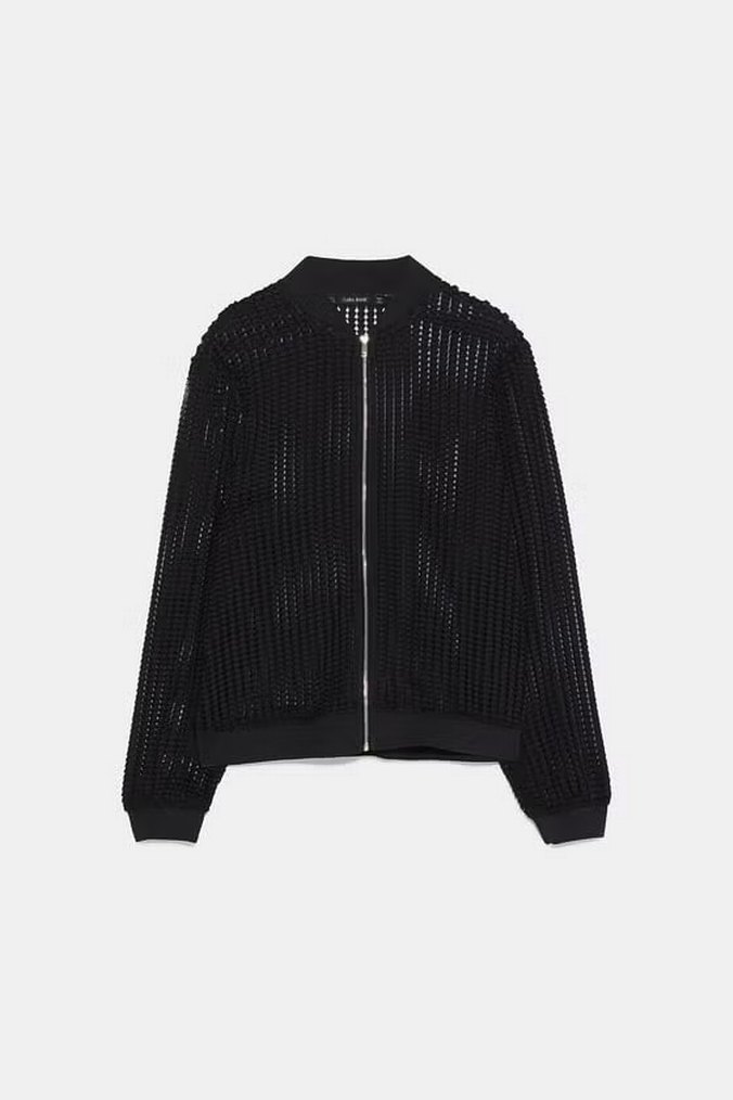Fermuarlı, uzun kollu, siyah kadın ceket. Notlu yaka ve dokulu sentetik kumaş ile günlük sokak modasına uygun kesim.
