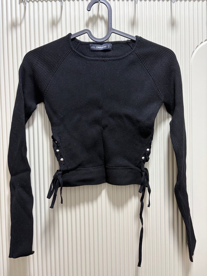 Siyah, vücuda oturan crop top, yanları ip detaylı dekoltesi olan güzel bir crop. Tüylenme var gibi duruyor ama çoğu toz siyah olduğu için öyle gözüküyor