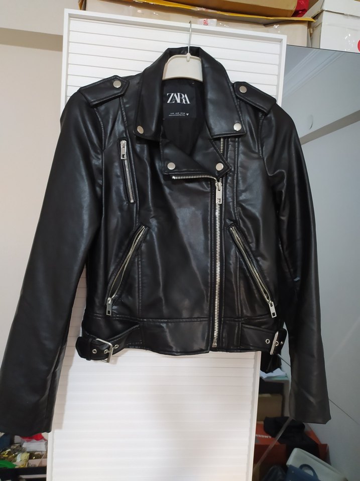Siyah deri biker ceket, çıtçıtlı yakalı, fermuarlı ve askılı kollu tasarımıyla trend ve rahat bir görünüm sunar. Günlük kullanım için uygun. çok az kullanıldı biraz kırışık duruyor bekledikçe açılır