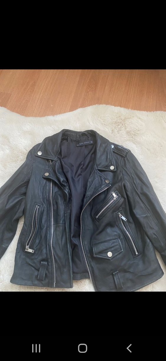 Siyah deri biker ceket, notalı yaka ve çoklu fermuarlı ceplerle birlikte dar kesimdir. Kemeri mevcut değil, yırtık vs yoktur.