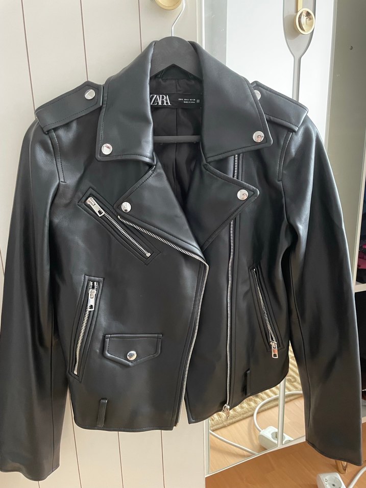 Zara'dan fitted kesim siyah deri biker mont, notched lapel ve fermuarlı detaylarla Paris tarzını günlük kullanıma taşıyor. M bedene de olur.