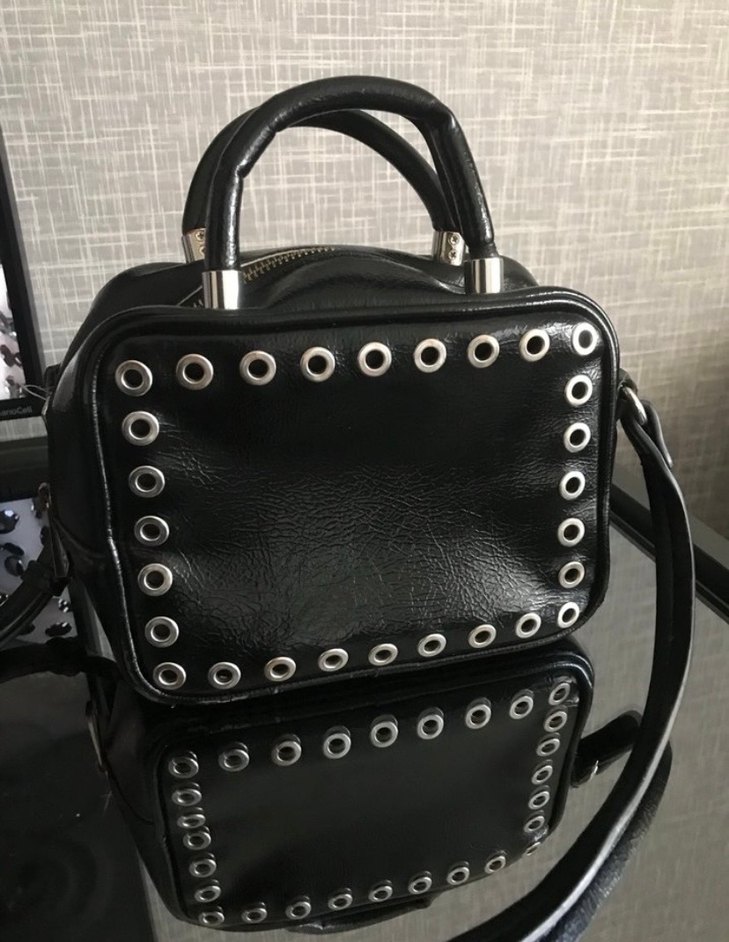 Siyah deri, tokalı detaylara ve metal halkalara sahip rock punk tarzında kadın çanta. Günlük kullanım için uygun, koyu renk ve baskılı desenli.