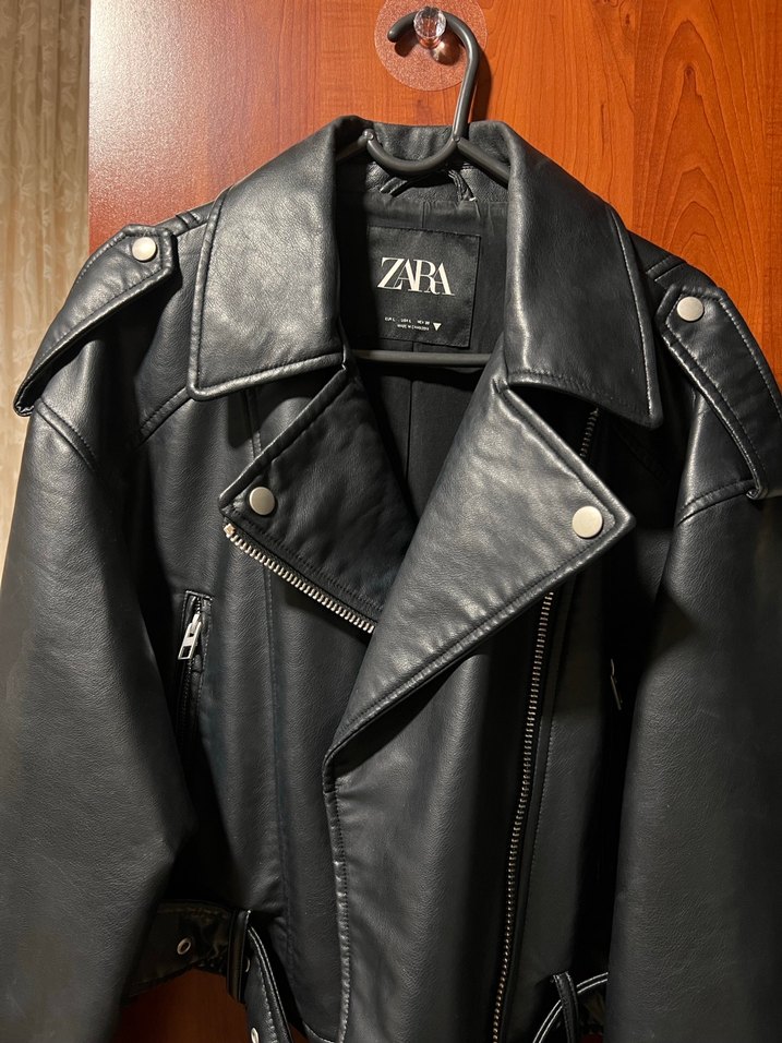 Zara imzalı siyah deri biker ceket, kesik yakalı ve fermuarlı. Strappy kollu, baskılı tasarımıyla grunge punk tarzını yansıtıyor. Bazı yerlerinde görselde gözüktüğü gibi soyulmalar var, ekledim. Tekliflere açıktır.