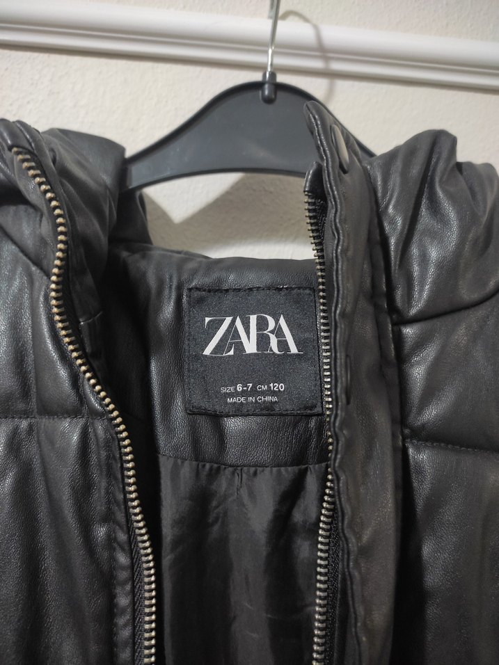 Zara marka, fermuarlı, siyah deri ceket. Dar kesim, bisiklet yaka ve baskılı detaylarla sokak modasına uygun.