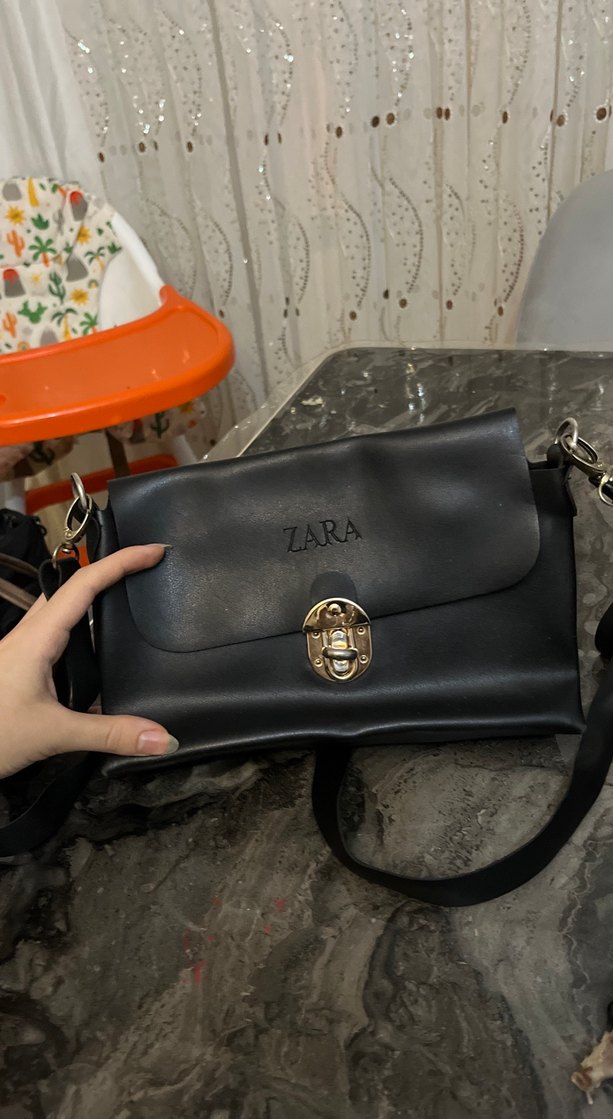 ZARA marka siyah deri kadın çanta, tokalı kapak ve baskılı logo detayına sahiptir, günlük sokak modasına uygundur.