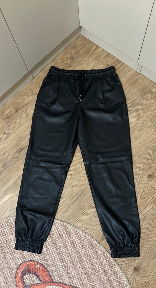 Zara siyah deri, lastikli paçalı kadın pantolonu, az kullanıldı yepyeni, günlük sokak tarzı için uygundur. S/M bedene uygundur.