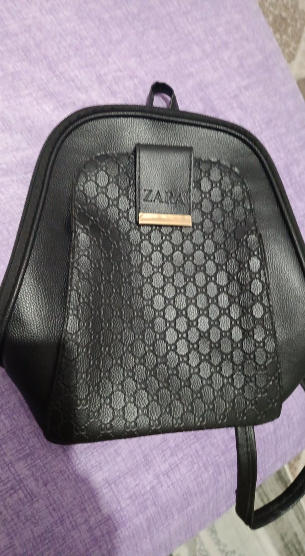 Zara marka, baskılı desene sahip siyah deri kadın sırt çantasıdır. Tokalı kapak detayı ile günlük kullanıma uygundur.
