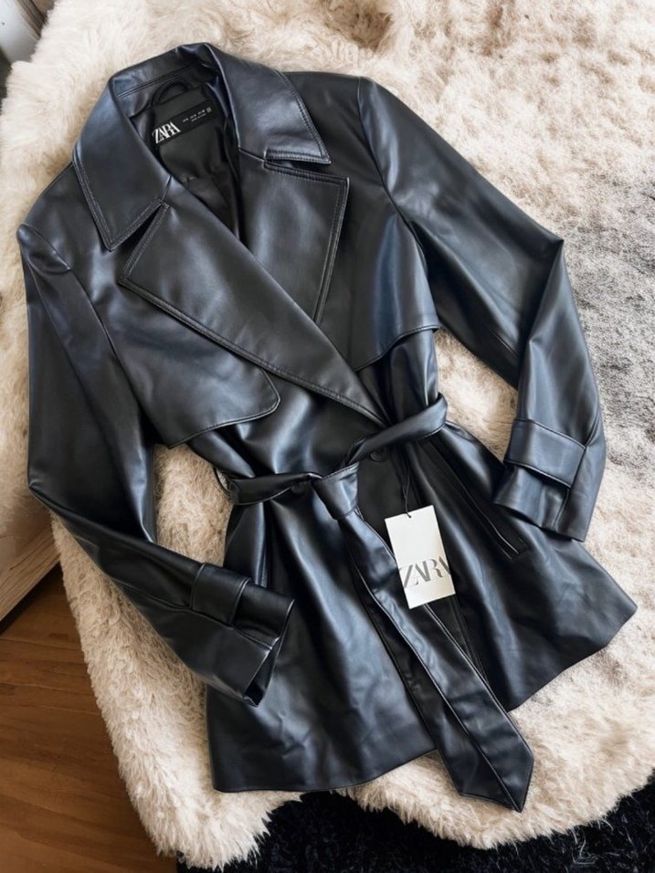 Zara'nın siyah deri ceketinde kesik yaka ve kemerli bel bulunur. Normal, midi boy ve askılı kollu, şık ofis tarzı için uygundur. Sıfır üründür Ptemium Ürünidür.