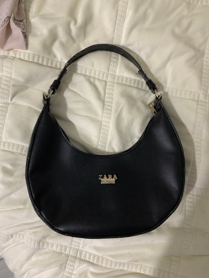 Zara siyah deri kadın çanta, kemerli sapı ve desensiz şık tasarımıyla günlük kullanıma uygun klasik gotik tarzda.