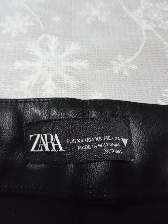 Zara siyah deri midi şort, baskılı desenli ve fermuarlı, dar kesim. Sokak stili ve günlük kullanım için uygun.
