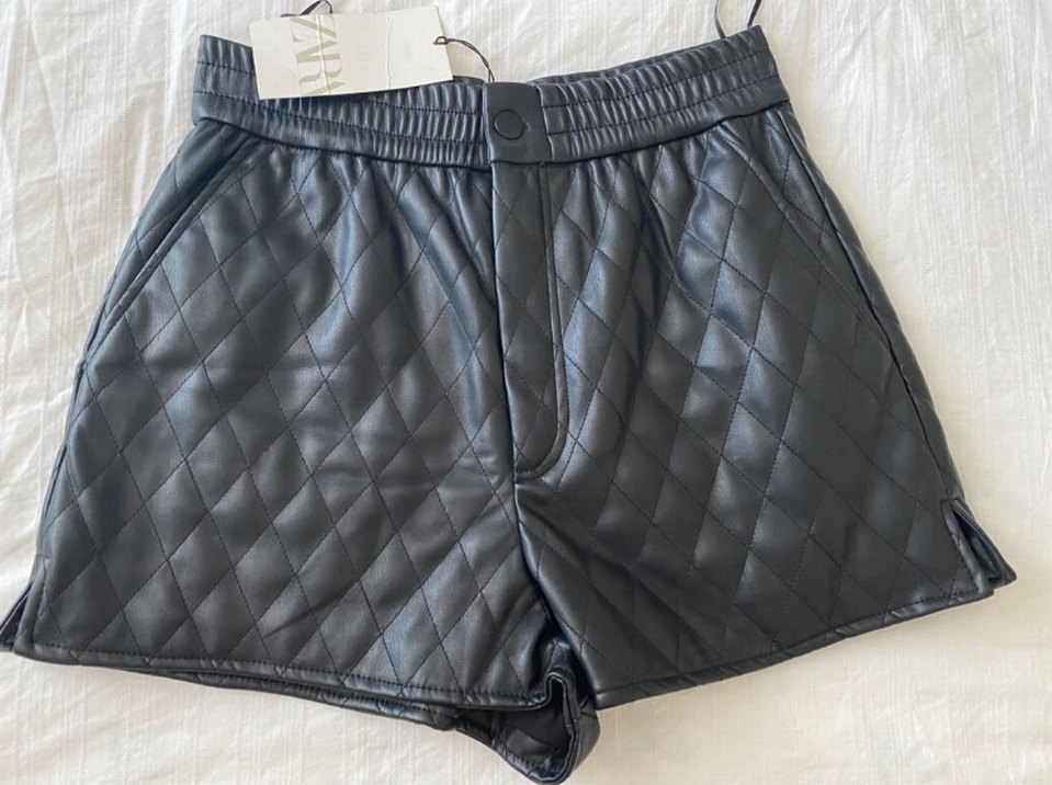 dar kesim siyah deri mini şort, kapitone deseniyle şık bir sokak stili sunar. Günlük kullanıma uygundur.