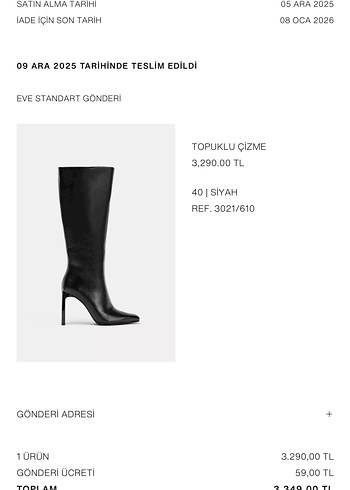 Siyah deri diz boyu çizme. Çok şık ve rahat ama ben hiç giyemedim çünkü bu kadar yüksek topuk kullanamıyorum, iade edemediğim için de satıyorum 40 numara. Topuk yüksekliği 9,5 cm