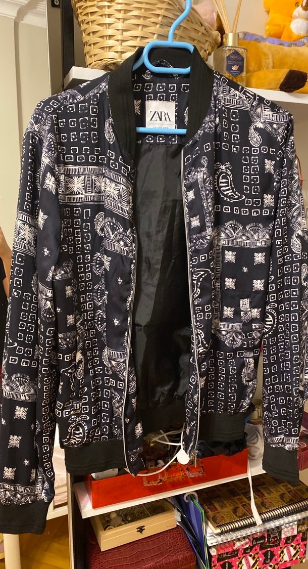 Zara markalı, desenli tekstil kumaştan yapılmış, uzun kollu ve geniş kesimli siyah midi ceket. Fermuarlı ve notalı yaka detayına sahiptir, günlük sokak stili için uygun.
