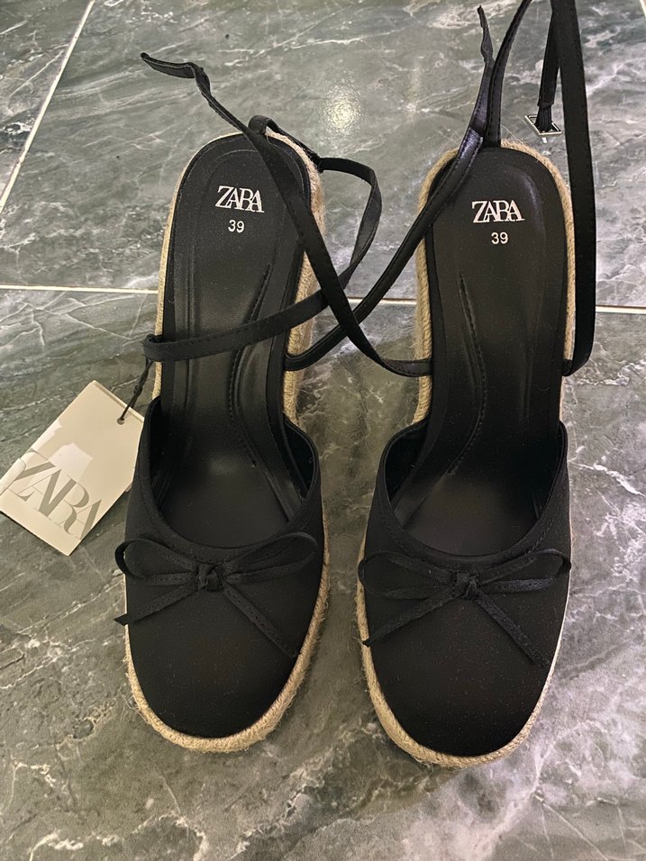Zara siyah dolgu topuklu espadril, tokalı kayışlı ve baskılı desenli. Yeni etiketli. Numara 39.
