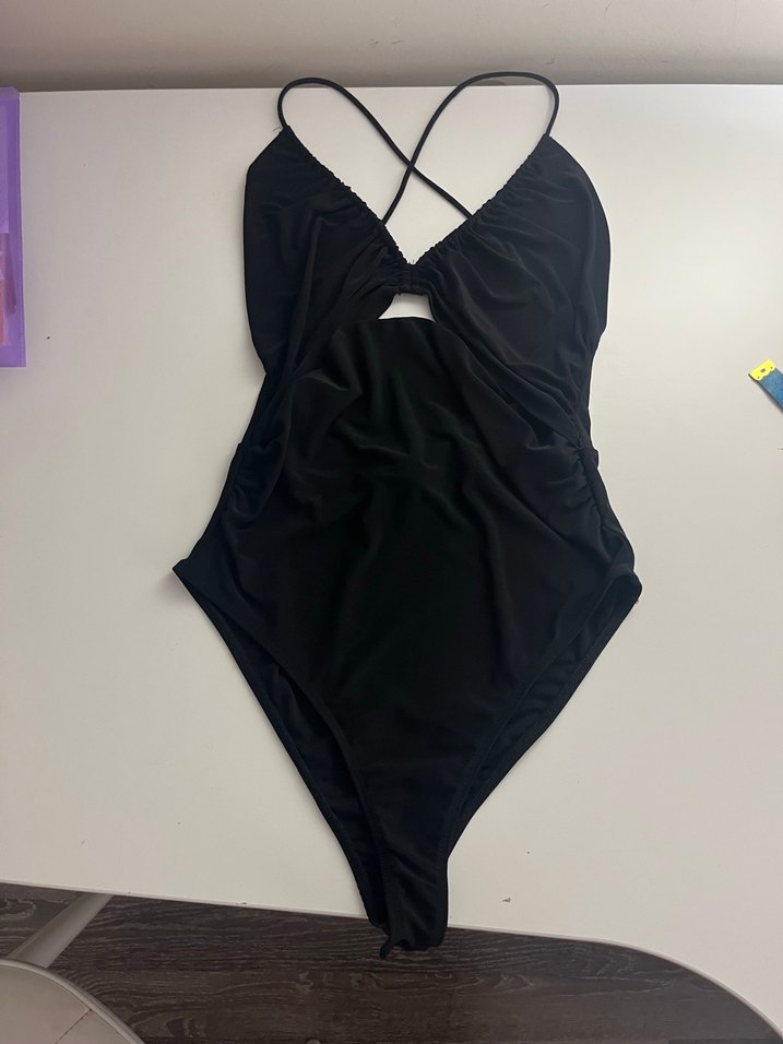Siyah, drapeli ve strappy askılı, vücuda oturan çıtçıtlı kadın body. Üst kısmı büzgülüdür ayarlanabilir fotoğraflarda mevcut karşılaştırma.