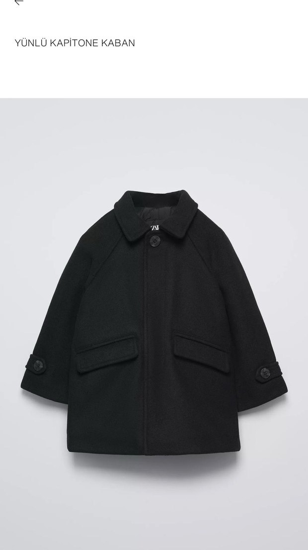 Klasik yaka, düğmeli kapama ve ön kapaklı ceplere sahip siyah kışlık kaban. ❄️