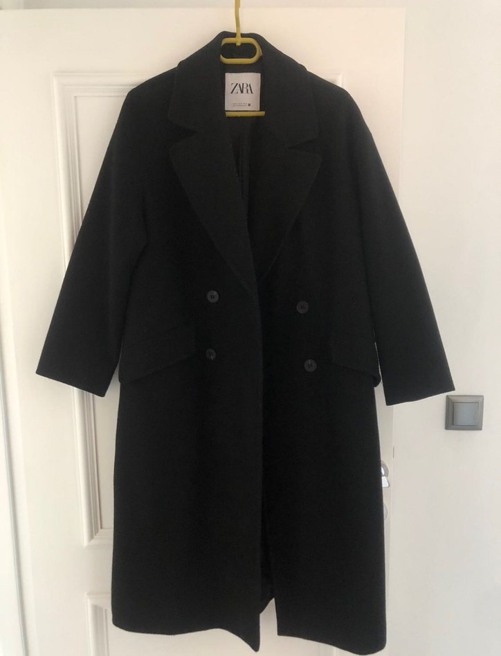 Zara siyah uzun kaban, çift düğmeli ve klasik yakaya sahip. Uzunluk 115 eni 58