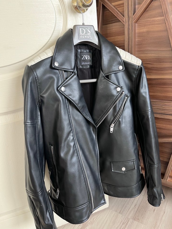 Zara siyah deri biker ceket, çıtçıtlı yakalı, fermuarlı ve baskılı detaylara sahip. Normal kesim, askılı kollu ve midi boyda, günlük kullanıma uygun.