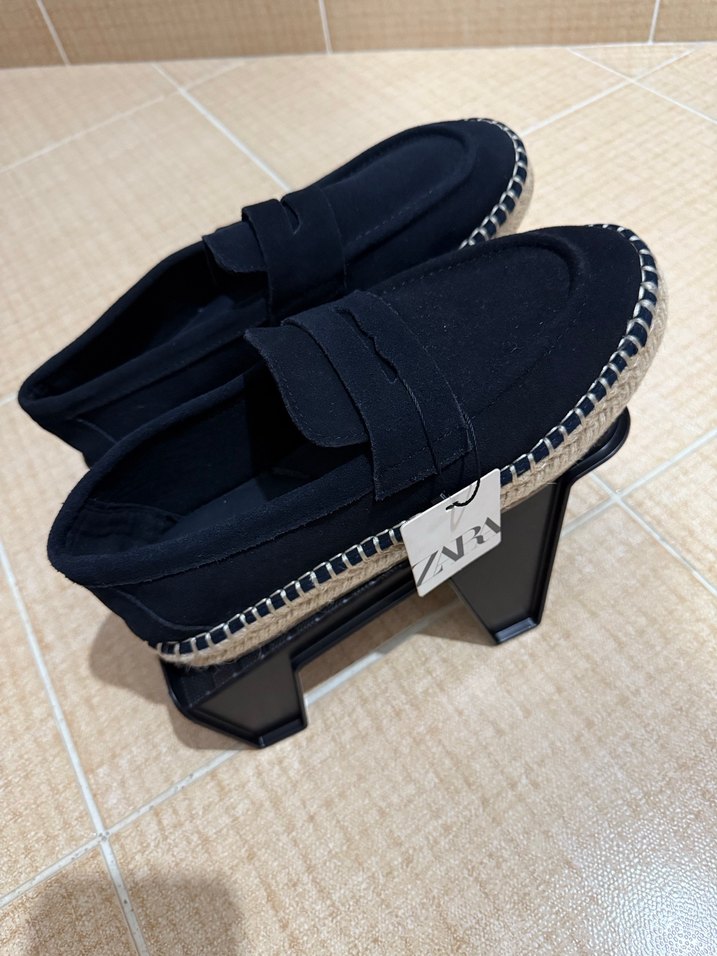 Zara marka sıfır ürün. Velcro bantlı, siyah erkek espadril. Günlük kullanıma uygun kauçuk tabanlı, minimalist ve koyu renk stil.