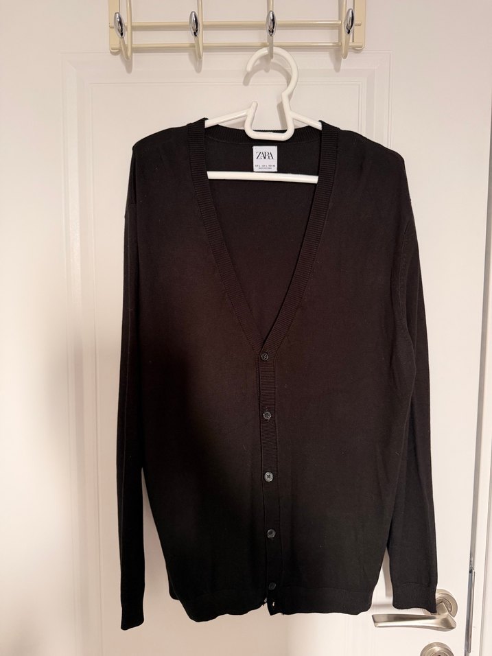 Zara siyah erkek hırka. L beden. Sıfırdan farksız, hiçbir kusuru bulunmamakta. Hiç giyilmedi. Boyu 73cm.