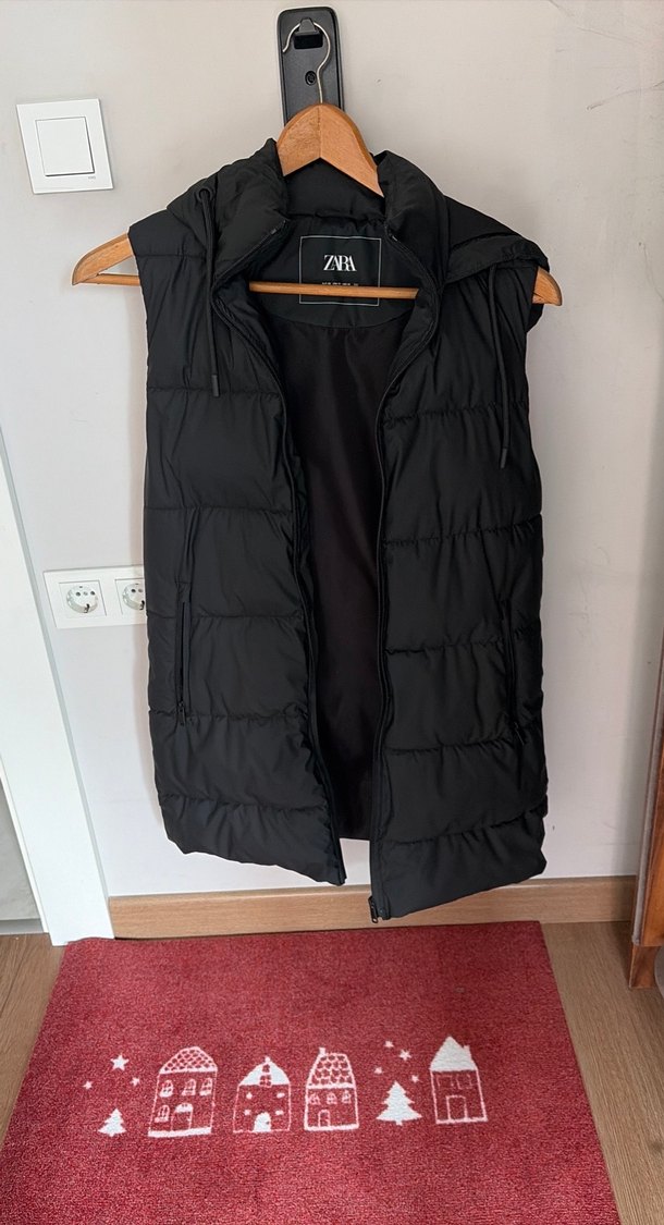 Zara siyah, fermuarlı, yüksek yakalı, kolsuz kadın yelek. Yumuşak ve sıcak kumaştan, rahat ve şık bir günlük sokak stili sunar.