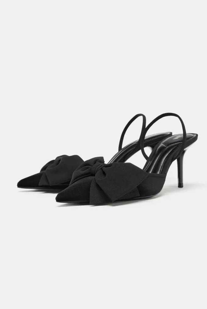 Siyah renkte, fiyonk detaylı ve sivri burunlu stiletto. Lastik malzemeden üretilmiş, romantik akşamlar için ideal şık bir tasarım.