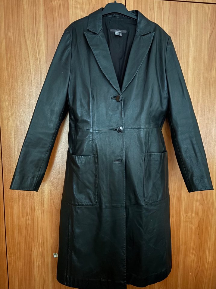 Uzun siyah deri ceket, düğmeli. Regular kesim ve uzun midi boy Kollu Large beden defosuz